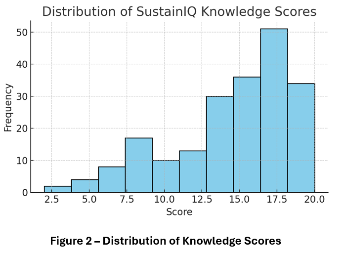 The SustainIQ dataset revealed that UNDIP’s community maintains a high level of sustainability awareness. The average knowledge score was 14.64 out of 20, equivalent to 73.2 percent accuracy. Scores ranged from a minimum of 2 to a maximum of 20, with a standard deviation of 4.12, suggesting moderate variation among respondents.